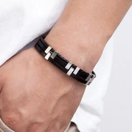 Charm Vintage Multilayer Zwart-Rvs Lederen Armband voor Mannen - Zakelijke Stijl en Formele Gelegenheden