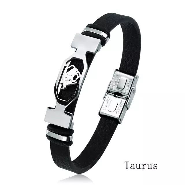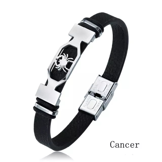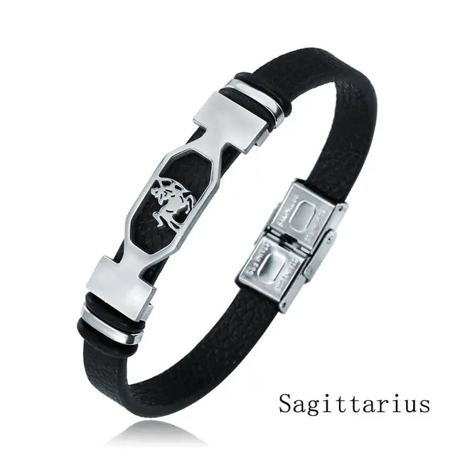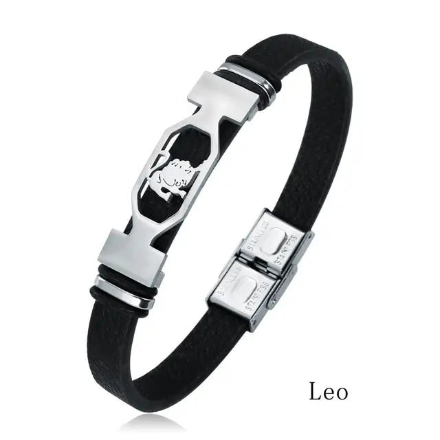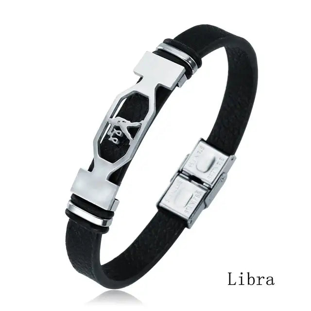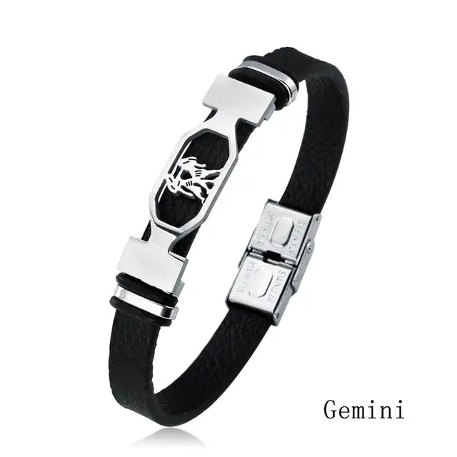 De armband is gemaakt van roestvrij staal en heeft een zwarte leren wikkeling voor een stoere uitstraling. Dit sieraad is perfect voor mensen die van astrologie houden of op zoek zijn naar een trendy accessoire.