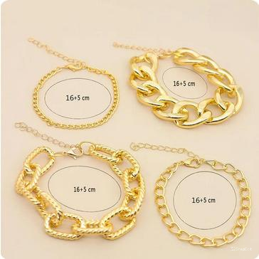 De set bestaat uit vier goudkleurige of zilverkleurig armbanden met een kettingschakelontwerp, wat zorgt voor een trendy en opvallende look.