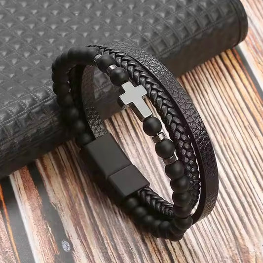 Lederen Herenarmband Klassiek – Handgeweven Meerdere Lagen, Kruis Accessoire voor Stijlvolle Mannen