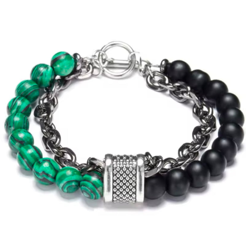 Ontdek de perfecte balans tussen authentieke natuurstenen kralen en een krachtige metalen ketting met de DualBond™ herenarmband. Gemaakt van natuurlijke malachiet en vulkanische stenen, ontworpen voor de moderne man die stijl en kracht wil uitstralen. Ideaal als verjaardagscadeau of om je look naar een hoger niveau te tillen.