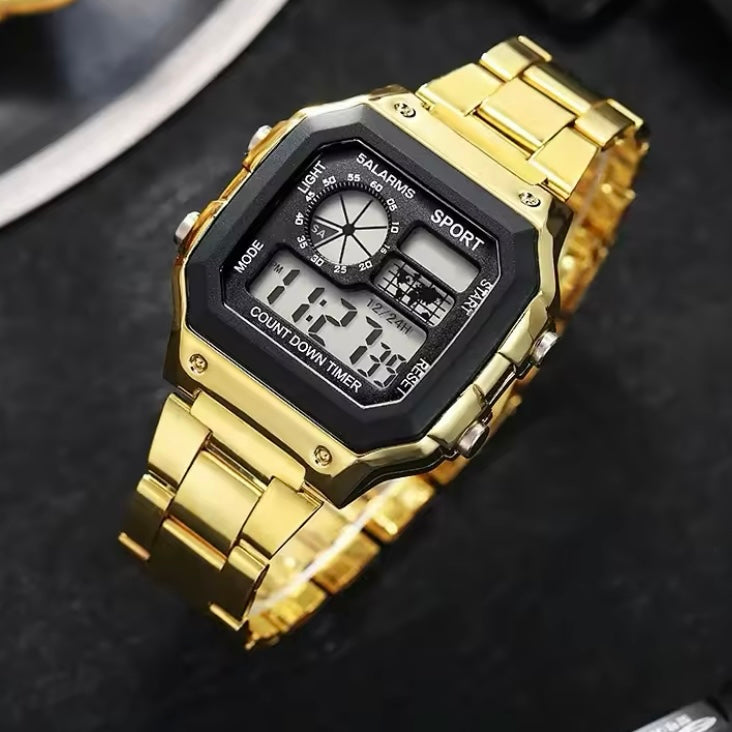 Ons Luxe Roestvrijstalen Sporthorloge combineert robuuste militaire stijl met moderne digitale functies. Met waterdichte eigenschappen en een duurzame LED-display, is dit horloge perfect voor elke sportieve man.