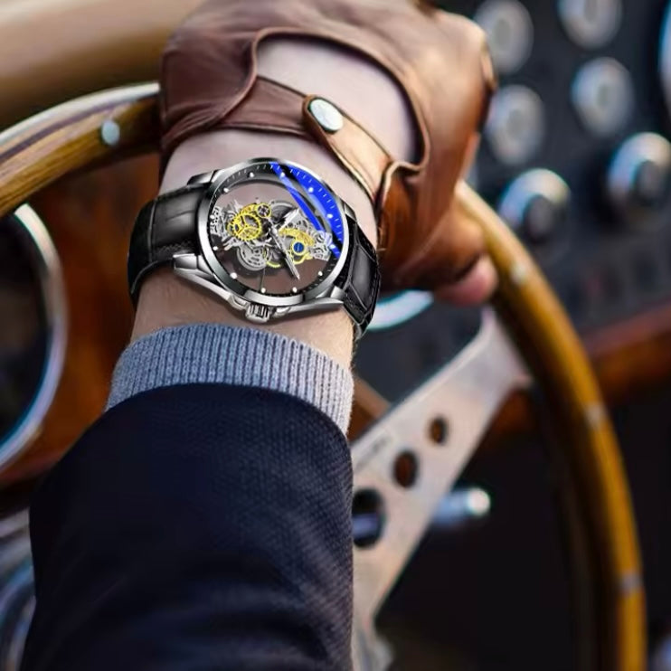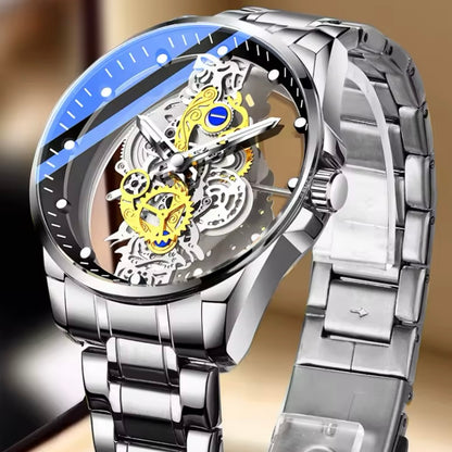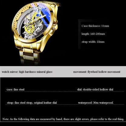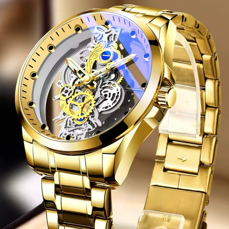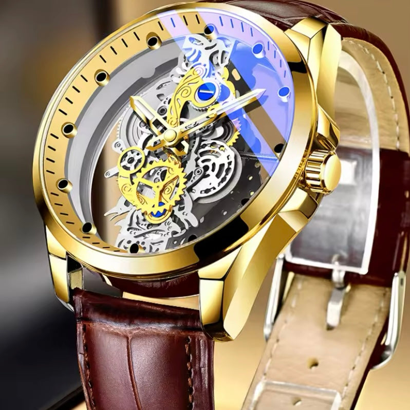Ervaar de tijdloze elegantie van dit nieuwe mannenhorloge met een prachtig skeletontwerp. Het gouden skelet biedt een retro uitstraling en toont het mechanisme van het horloge op een unieke en indrukwekkende manier.