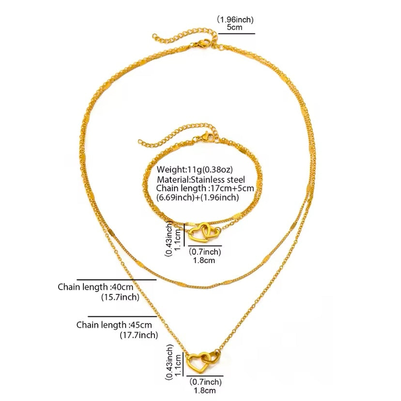 Deze prachtige set bevat een verfijnde liefdearmband (17+5 cm) en een elegante dubbele ketting (40 cm en 45 cm), ontworpen om je look te verrijken met een moderne, chique flair.