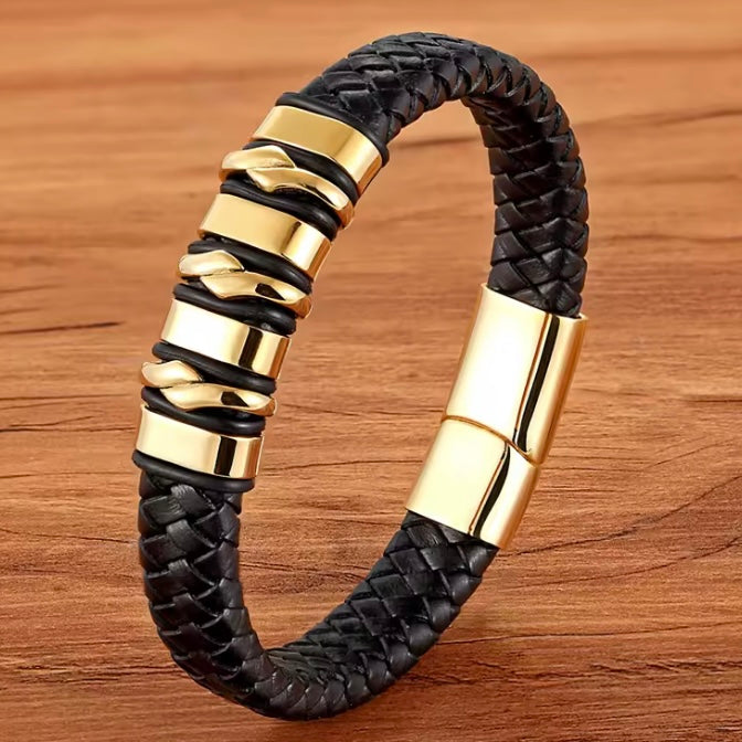 Deze unieke armband is met de hand gevlochten en bevat premium leer, afgewerkt met een goudkleurig roestvrijstalen magnetische gesp.