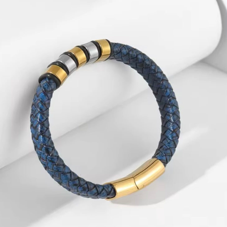 Vintage blauw leer geweven magnetische gesp armband (21 cm)