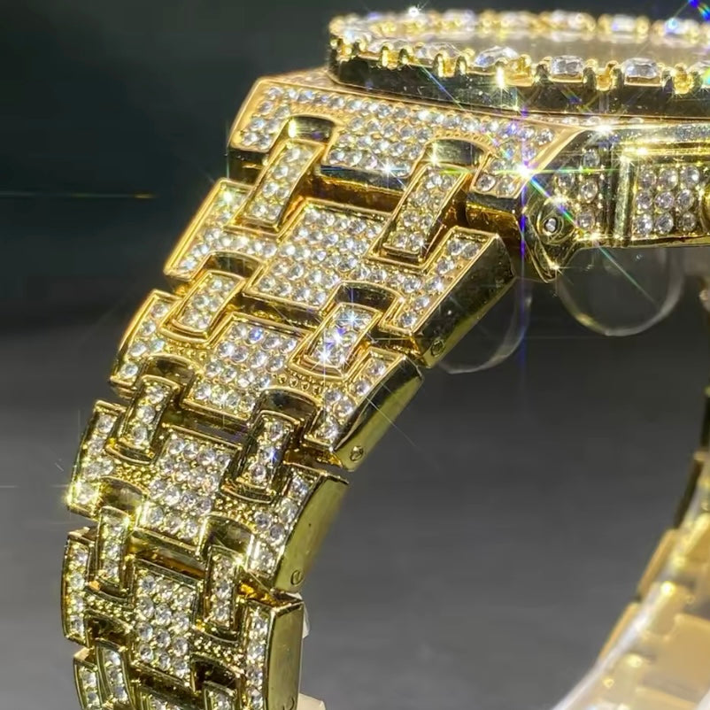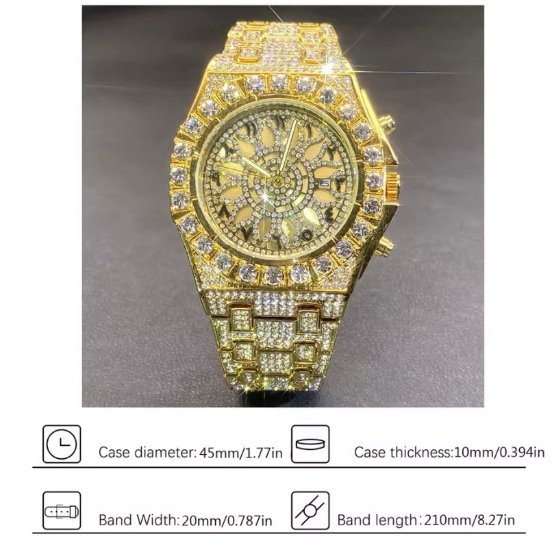 Voeg luxe en glamour toe aan je stijl met dit gouden herenhorloge, afgewerkt met volledige diamanten en een iced armband. Dit waterdichte horloge van roestvrij staal is niet alleen een modeaccessoire, maar ook een statement van verfijning en kracht. De nieuwe wijzerplaat en het trendy ontwerp maken het horloge de perfecte keuze voor mannen die op zoek zijn naar luxe en precisie. Ideaal als cadeau of om jezelf te verwennen met een luxe klok die gegarandeerd de aandacht trekt.