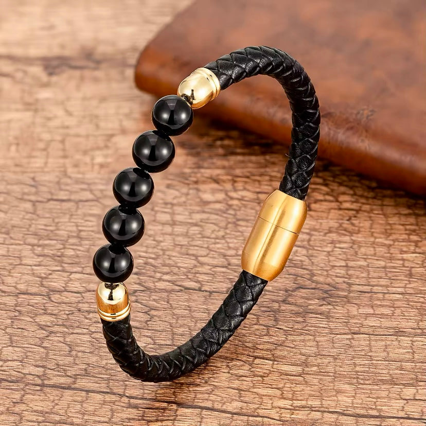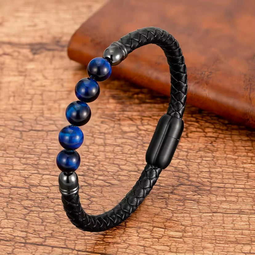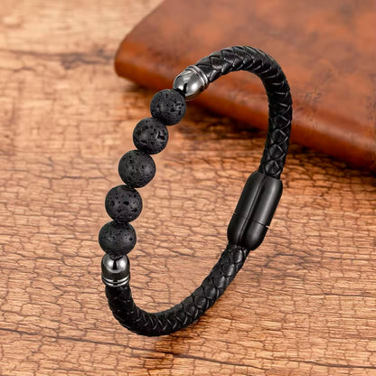 De lavasteen kralen bevorderen een gevoel van balans en stabiliteit, terwijl het roestvrij staal duurzaam en hypoallergeen is. De armband is afgerond met een echte leer band die comfortabel zit en een unieke uitstraling heeft.